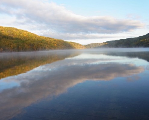 We wanted to take advantage of the latest break in rain by doing another hike on the Kenai Peninsula. The Siklak lookout tour looked to be a good option at least in length. Since we can’t really buy a hiking guide for every region we visit we often have to take what comes along not really knowing much about the hike or the area. This time however we really got lucky. The hike was wonderful, it followed the edge of a hillside overlooking Siklak lake up to the top of a hill with a spectacular view of the area. The path meanders through tall stands of Fireweed that this time of year is full in seed almost like dandelions. With every breeze the air is filled with the seeds almost as though it was snowing. The whole hike overlooks the turquoise waters of the lake; surrounded by snow-covered peaks. It was absolutely fantastic! The higher we climbed the more the amazing panorama unfolded until we are presented with an almost indescribably beautiful view of the entire area. The icing on the cake of our hike was the golden hues of the late afternoon sun creating rainbows as rain showers drifted by on the other side of the lake. We were rather lucky where we were as the rain did not come to our side, that and we had front row seats for the nature show. To top off the day we found another free campground (No Service, No Fees) at Hidden Lake where we set up our camp for the night. The temperatures were starting to regularly dip below freezing during the nights now and as we climbed out of the Land Rover we could see steam rising from the lakes waters into the cold morning air.