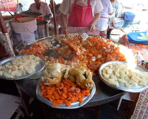 The main market in Patzcuaro was our very first visit to a real Mexican market, something neither of us had experienced before. It took up an entire city block and was absolutely fascinating with stand after stand filled with mountains of all manner of fruits and vegetables. We walked past huge stacks of delicious Mangos, Bananas, Granadillas and all manner of other exotic fruits that set our mouths watering. The plan was to simply take a quick look around but before long we had several bags filled with the yummiest offerings in our hands. On all sides, one could hear the vendors vying for the attention of fickle customers. Often, we were offered tastes of the wares when we tarried a little too long at a particular stand. It is definitely not the ideal place for sufferers of claustrophobia as the market is so full of people one couldn’t help but be jostled and bumped in the narrow paths, or be forced to squeeze through a crowd of people. It also felt as though we were lost in some kind of labyrinth with one path leading to the next and in no time all orientation was gone without a clue as to where we were, or how to leave. No bother though, you can walk through the market for hours simply observing all the different offerings because finding just about everything for sale one could imagine. After the fruit and vegetables, we arrived in the dried section and were greeted by mountains of all manner of dried beans, colorful spices and naturally a variety of chilies you could imagine – after all we were in Mexico. Outside the roof of the stalls were mainly tarpaulin to protect from the sun and rain, but there was also an inside to the market where along with clothing you could find every type of kitchenware imaginable and last but not least a huge meat section, which incidentally we passed through as quickly as possible trying not to breath. Though the smell was quite strong and unappetizing it was nevertheless still interesting to walk through. From half a cow, chickens, pigs’ feet and intestines every part of the animal was for sale either hanging from a hook or lying uncooled in the heat of the afternoon. The smell of decomposing meat was so strong we wondered who in their right mind would buy such meat. Loads of people appeared not to be in their right minds as evident in the long lines of customers waiting to buy meat who apparently didn’t seem to mind the smell at all. For us however, it was all a bit too suspect and decided to continue with our vegetarian dishes until we could find meat that was properly cooled, hygienically stored and neutral smelling. In another section of the market were the cooked food stands are, one could buy a very reasonably priced if not cheap lunch, though after passing through the meat section you would have to have no fear of food poisoning or be a local to eat there. In huge pans (think massive woks) all manner of dishes were being prepared mostly consisting of a mixture of meat, potatoes and vegetables and offered with stacks of the ever present corn tortillas. It looked and smelled very appetizing but we simply didn’t trust the meat and decided instead to limit ourselves to observing and taking photos.