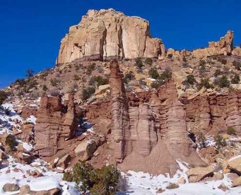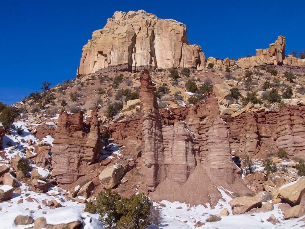 Am nächsten Tag – nun wieder erholt und ausgeschlafen – begeben wir uns auf ein kleines Abenteuer abseits der 12 und biegen in die Burr Trail Road ein. Es gibt mehrere Straßen die direkt in die Grand Staircase führen, doch sind sie nicht asphaltiert und man warnt uns eindringlich vor der Gefahr des Steckenbleibens in dieser Jahreszeit. Der Burr Trail ist allerdings eine asphaltierte Straße und so wollen wir uns diese Gelegenheit auch nicht entgehen lassen. Wir haben allerdings keine Ahnung was uns erwartet und sind somit freudig überrascht, dass der Weg nach einiger Zeit bergab und anschließend direkt durch einen Canyon führt! Herrvorragend! Auf so eine Gelegenheit hatten wir die ganze Zeit über schon gehofft. Links und rechts von uns ragen steil gigantische rote Felswände auf. Hinter jeder Biegung ändert sich das Bild und wir kommen aus dem Fotografieren gar nicht mehr heraus. Über 2 Stufen geht es die „Treppe“ nach unten bis die Straße schließlich in eine Piste übergeht, die wir aber nicht befahren wollen. Trotzdem wagen wir einen Abstecher auf eine verschneite Nebenpiste, der sich als abenteuerlich herausstellt. Am Anfang gibt es noch Reifenspuren denen wir folgen können, doch hören diese nach ein paar Kilometern plötzlich unverhofft auf. Ein Stück weit tasten wir uns noch vor, entscheiden uns dann aber zur Umkehr da wir uns in dieser abgelegenen Gegend definitiv nicht festfahren wollen. Wir finden einen idyllischen Übernachtungsplatz unter einer großen Ponderosa Pinie neben versteinerten Dünen und können es mal wieder überhaupt nicht fassen, tatsächlich hier in dieser einmaligen Natur zu sein!