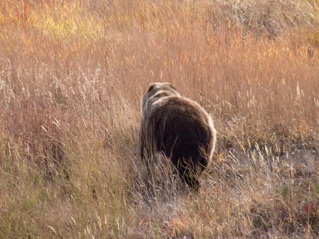 Auf dem Weg nach Whitehorse haben wir eine unverhoffte Begegnung am Straßenrand: Endlich sehen wir einen Grizzly Bären! Wir waren schon enttäuscht, bisher noch überhaupt keinem begegnet zu sein, obwohl überall Bärwarnschilder hängen und fast jeder Alaskareisende mindestens eine Grizzlygeschichte auf Lager hat! Fasziniert beobachten wir den Bären wie er nicht weit von der Straße entfernt auf irgend etwas herumkaut und dann gemächlich seines Weges trottet. Wir freuen uns über die Begegnung, sind aber natürlich froh, ihn aus respektvoller Entfernung zu sehen und nicht unverhofft auf einer Wanderung oder beim Zelten auf dem Weg ins Gebüsch um gewisse Dinge zu verrichten.