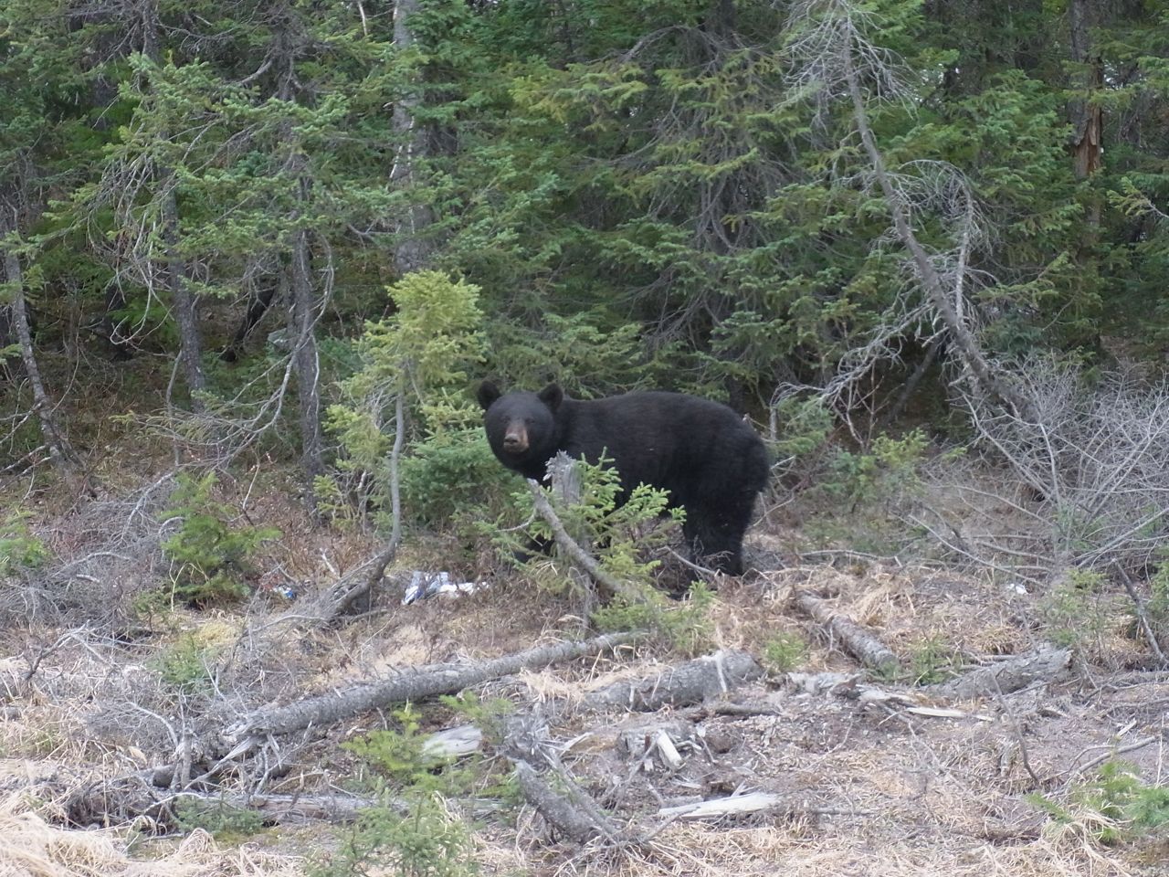 until after visiting Cartwright that we saw our first wildlife in the form of two Black Bears. The first one bolted into the woods as soon as we stopped the car. We cursed our luck and lack of photographic evidence that there is actually wild life in Labrador. The second bear we saw acted quite strangely as we pulled over to observe it and take a couple of pictures. Instead of bolting into the woods, as the first one did, this one slowly moved parallel to the road. Photo! Yes! Now we actually have proof. That not being enough, now that we have actually seen a bear after so many days of nothing, not even a squirrel! I whistled and called to it just like the stupid tourists that I normally make fun of, so that it would turn it’s head and we could maybe get that perfect National Geographic shot. And it did turn its head, and then it turned more than it’s head. The head, with the rest of the bear following, started to slowly approach the car. The cat-calls, hoots, howls, growls and sounds of several other barnyard animals that I could think of suddenly didn’t seem to be all that much of a good idea any more.