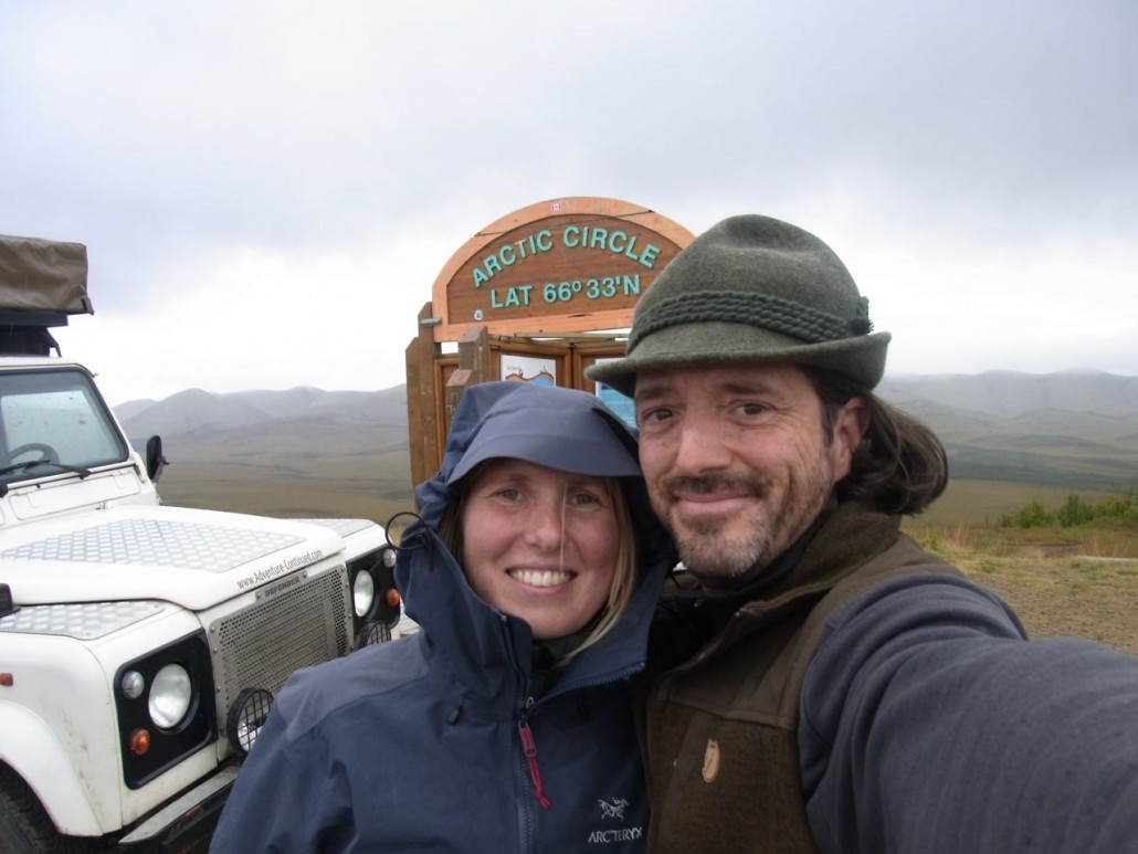 After spending the night at the engineer creek campground, with a wonderful campfire, we once again woke to a rainy morning. As we climbed down from the tent we noticed that the ground here had turned into a mud with the consistency of chocolate pudding. The roads, as it turned out, were also now made of chocolate pudding, and it hadn’t rained all that much really. It felt almost more like swimming than driving actually and in not time we were in a real mud bath. After a while driving the black mush was covering almost the entire vehicle so much so that we couldn’t see out of the back windows anymore. At about midday we reached Eagle Plains, a kind of midway refueling point, and we couldn’t believe our eyes when we got out of the Landy. Our logo was no longer recognizable, our bikes were under a centimeter thick coating of muck, and our license plate had vanished! We really had to laugh – we had certainly never experienced something like this before. With the rain and the wind howling we headed into the only restaurant here and ordered a hot lunch. After about an hour or so, warm and with full bellies, we headed back out into the mud bath that was the Dempster toward the Arctic Circle.
